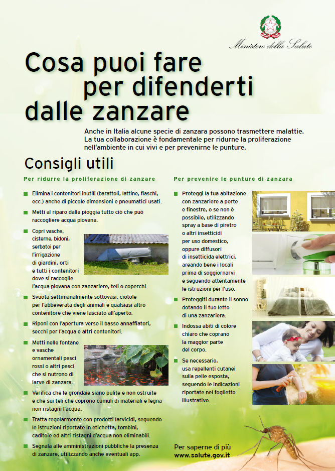 - Evitare il ristagno di acqua in contenitori, tombini, sottovasi o altri oggetti che possono favorire la proliferazione delle zanzare;